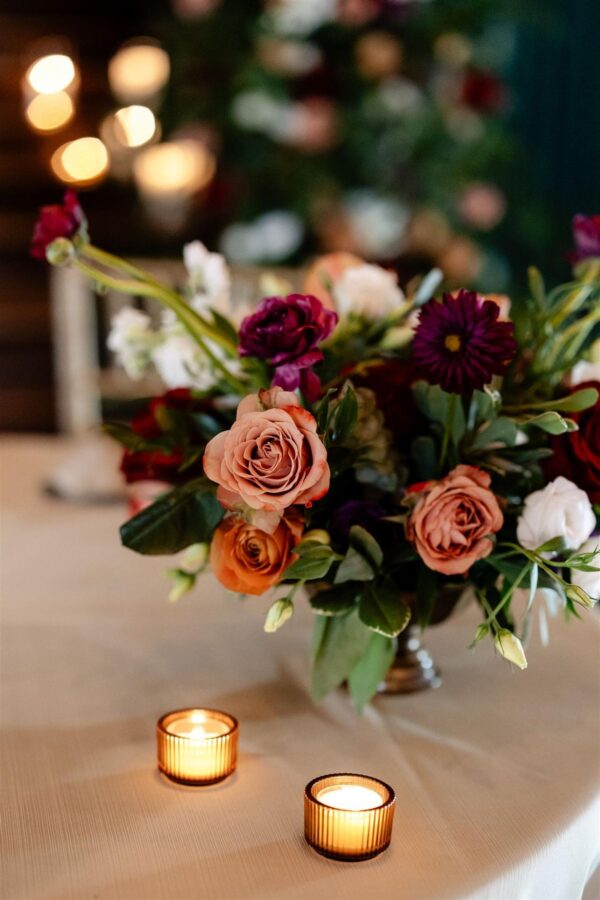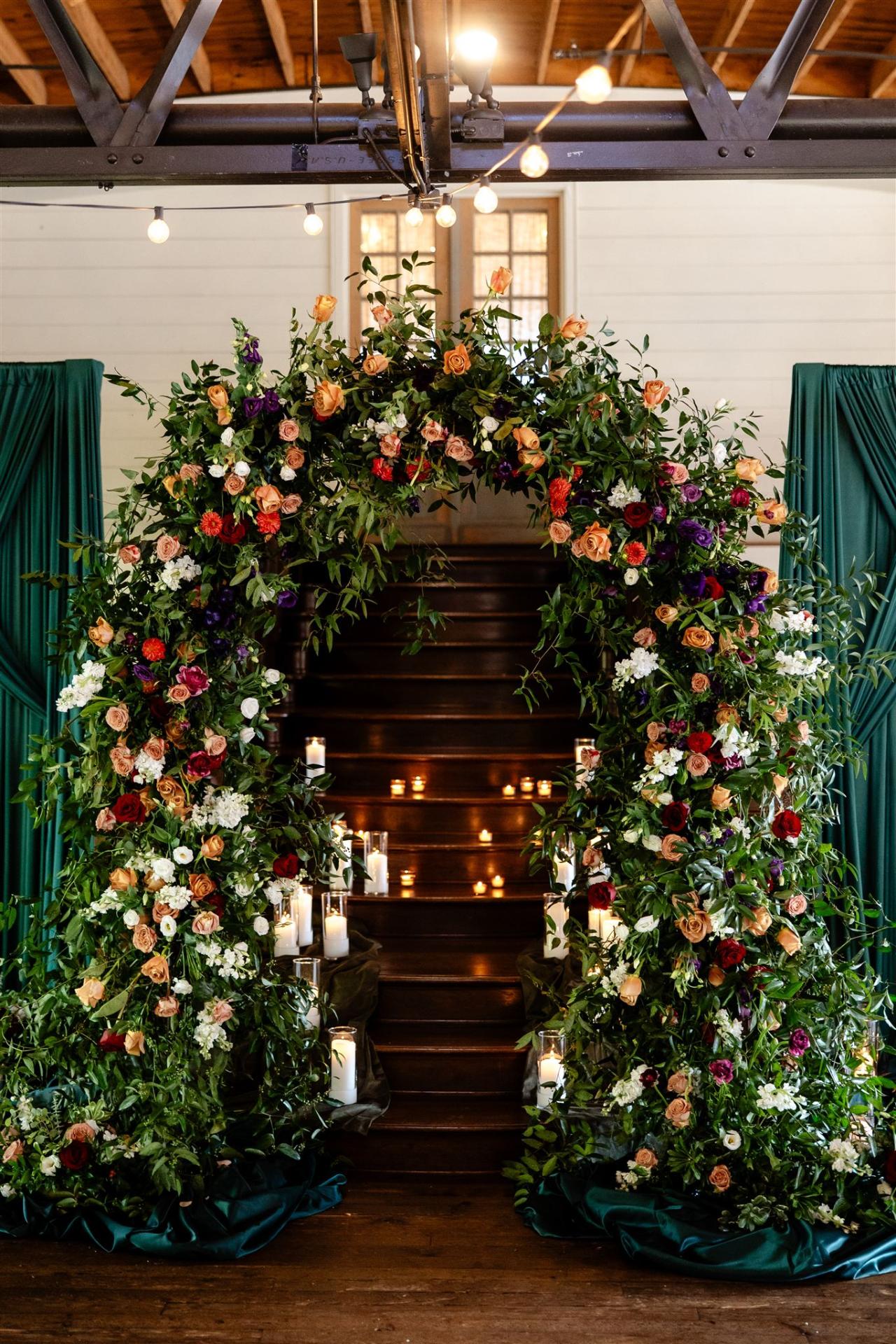 Our wedding at Summerour Studio was an intimate celebration of texture, tone, and trusting collaboration. We designed a stunning arch, abundant with lush greenery and layered with moody florals in plum, brown, and pastel pink. Cappuccino roses played a pivotal role, bridging the delicate ivory blooms and the deeper, moodier petals while tying into the surrounding foliage. Soft drapery framed the arch on both sides, purposefully diminishing the white walls behind and creating a warm, romantic focal point that felt both classic and modern.