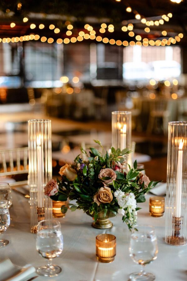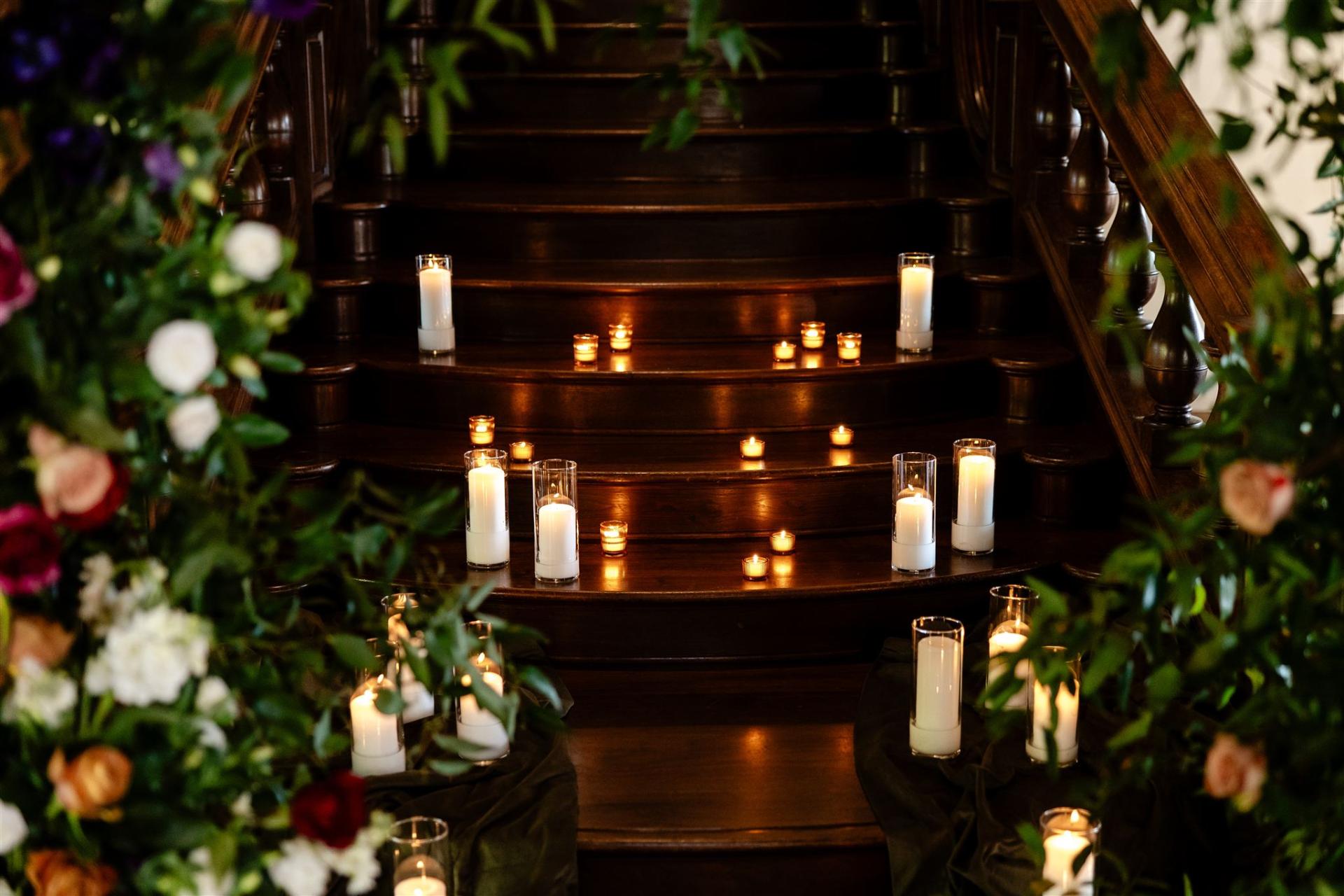 To maintain a cohesive flow between moments, all florals from the reception were carried through to the ceremony, creating continuity and an effortless sense of abundance. The aisle gleamed with a sea of candles — tapered, votive, and pillar — that cast a gentle, flickering glow against the petals and fabric. Above, the ceiling was layered with southern smilax, its trailing tendrils forming an airy, suspended canopy that invited guests to look up and linger in the moment.